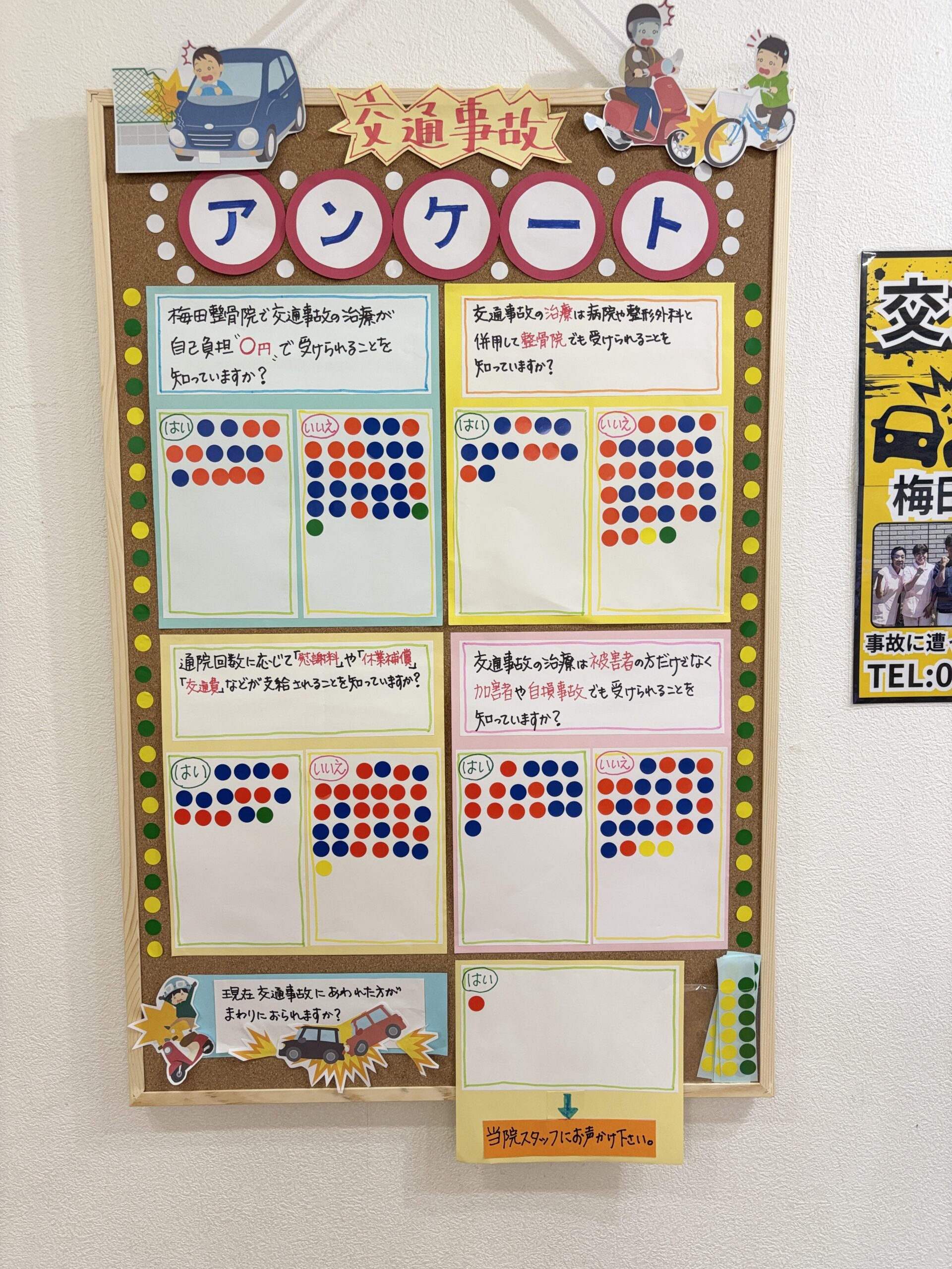 9月は交通安全運動の時期でもあるため、梅田整骨院では患者様に「交通事故治療の正しい知識を知ってもらうこと」を目的にアンケートを実施しました。